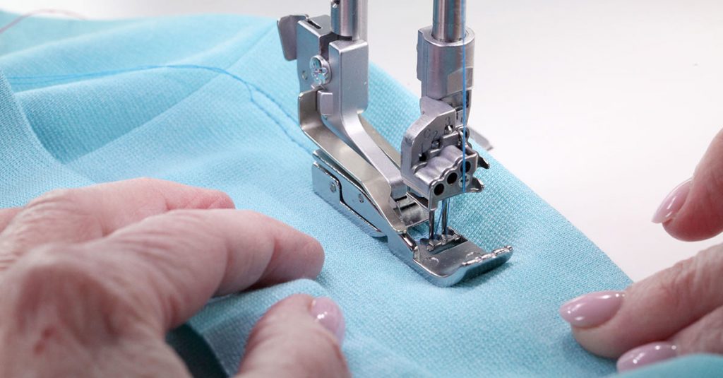Practice using a narrow coverstitch as you flawlessly hem an unbound neckline for casual or dressy garments.